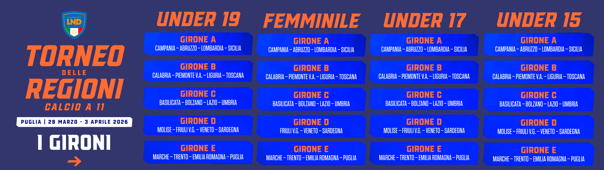 La manifestazione di calcio è riservata alle 79 Rappresentative Under 19, Under 17, Under 15 e Femminili dei diciotto Comitati Regionali e dei CPA di Bolzano e Trento riunite in un unico grande evento che andrà in scena in Puglia dal 28 Marzo al 3 Aprile. L’ultimo Torneo delle Regioni organizzato dal Comitato Regionale presieduto da Vito Tisci risale al 2017 nella competizione dedicata interamente al C5 mentre il calcio a undici torna in Puglia dopo ben 38 anni. Il numero uno del Cr Puglia Vito Tisci ha sottolineato il valore del torneo che va oltre il calcio giocato: ”Giocheremo nelle province di Bari, Brindisi e Lecce. Siamo pronti ad accogliere tutta l’Italia della LND per far scoprire ai giovani calciatori ed alle calciatrici le bellezze della nostra Regione. Siamo certi che sul campo sarà uno spettacolo ma ci teniamo a valorizzare soprattutto l’aspetto sociale della competizione perché il Torneo delle Regioni rappresenta un momento importante di condivisione dei valori dello sport e della vita”.